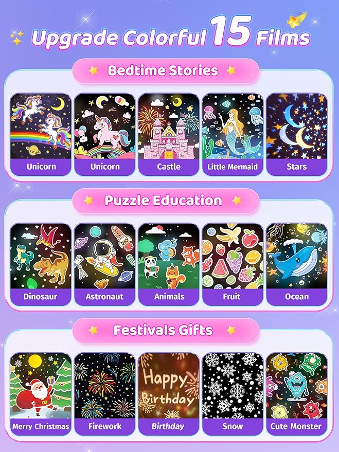- 🎀15 FILMS STAR PROJECTOR FOR KIDS: The star projector for kids/ star night light projector has 3 THEMES & 15 FILMS: Bedtime Story, Puzzle Education, Festival Gifts: Starry Sky, Unicorn, Mermaid, Birthday, Dinosaur, Astronaut... Star projector for kids is clear that kids can pointing out all the animals on the wall. Kids night light projector shines in the dark, create a bright world that activates kid's imagination & helps them sleep.Kids feel like they are in the universe looking at the stars! Girls can change the star projector for kids, star night light projector, star lights for ceiling to their fav film, and have a different bedtime experience to enjoy sweet dreams~