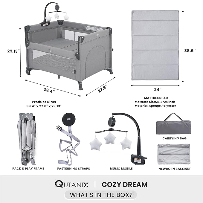 - TRAVEL FRIENDLY PORTABILITY & EASY FOLDING - Designed for families on the go, Qutanix Baby Bassinet boosts ultra portability and convenience . The easy folding mechanism transforms this 2-in-1 Pack and play into an ideal solution for travel or storage. The lightweight yet sturdy construction, along with features like detachable bassinet, makes the travel bassinet the perfect companion for your family's active lifestyle, ensuring that your baby feels secure and comfortable wherever your journey takes you to.