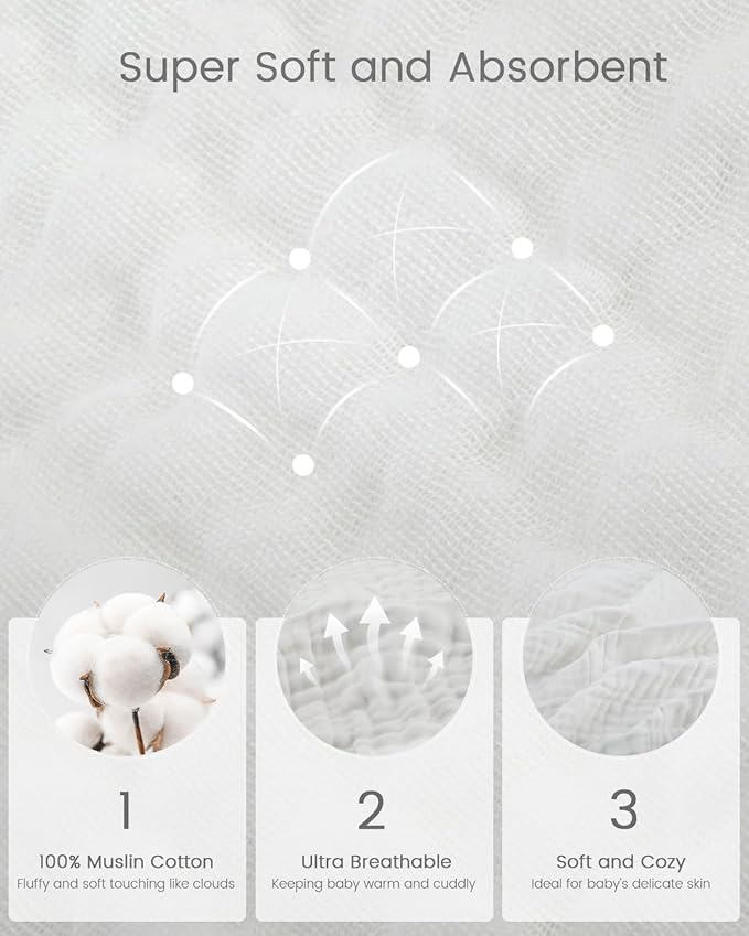 - Super Soft & Cozy: Our hooded baby towels are made from 100% muslin cotton for softness and breathability, it's a great choice for gentle, soft absorbency, these baby towels with hood are super soft and gentle on baby's skin