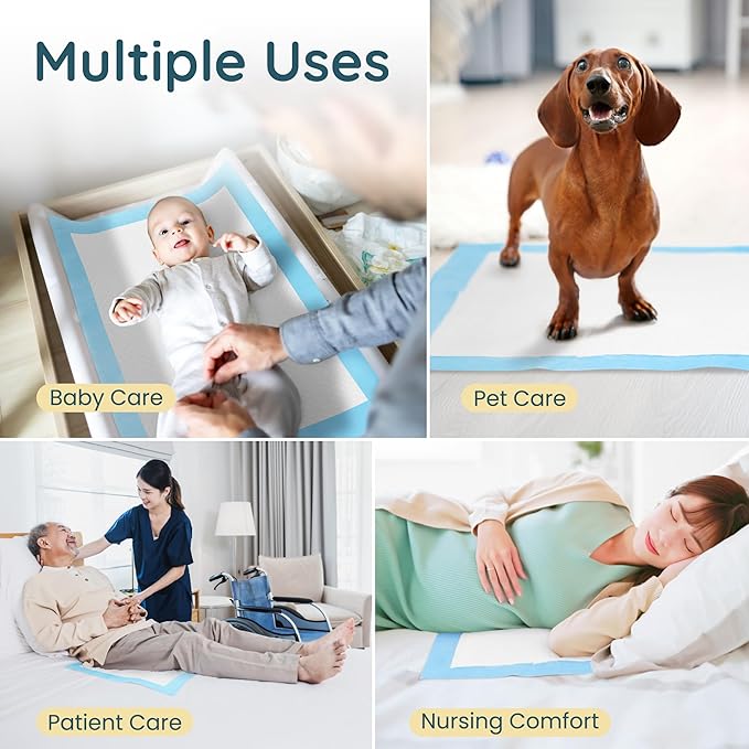 - Multi-Purpose: Disposable underpads are versatile for use on chairs, beds, floors, or in strollers for all ages. Perfect for diaper changes, menstrual care, pets, nursing and more.