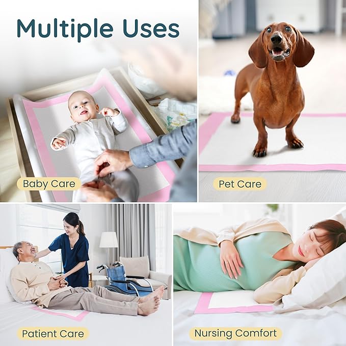 - Multi-Purpose: Disposable underpads are versatile for use on chairs, beds, floors, or in strollers for all ages. Perfect for diaper changes, menstrual care, pets, nursing and more.