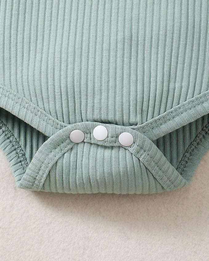 - Unique Design:A solid green color long sleeve ribbed knitted romper matching adorable ruffle fly sleeve,The bottom of the romper has a snap-button design for easy diaper change, white daisy print long pants with an elastic waistband, in front of which fixed with a big bowknot.This baby girl outfit comes with a hat and headband,such a perfect 4 pieces suit gift for your little baby.