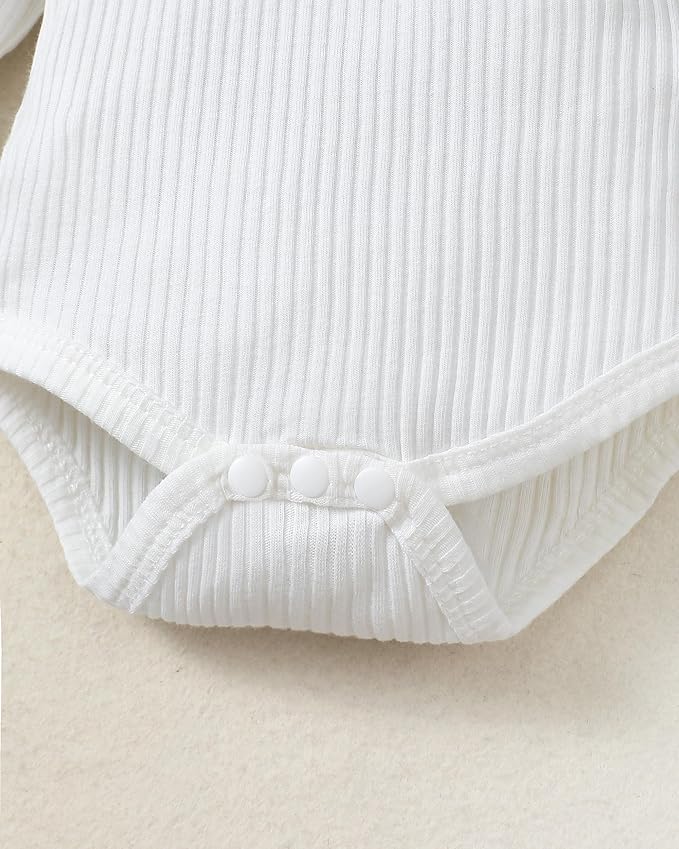 - Unique Design:A solid white color long sleeve ribbed knitted romper matching adorable ruffle fly sleeve,The bottom of the romper has a snap-button design for easy diaper change,blue strip long pants with an elastic waistband, in front of which fixed with a big bowknot.This baby girl outfit comes with a hat and headband,such a perfect 4 pieces suit gift for your little baby.