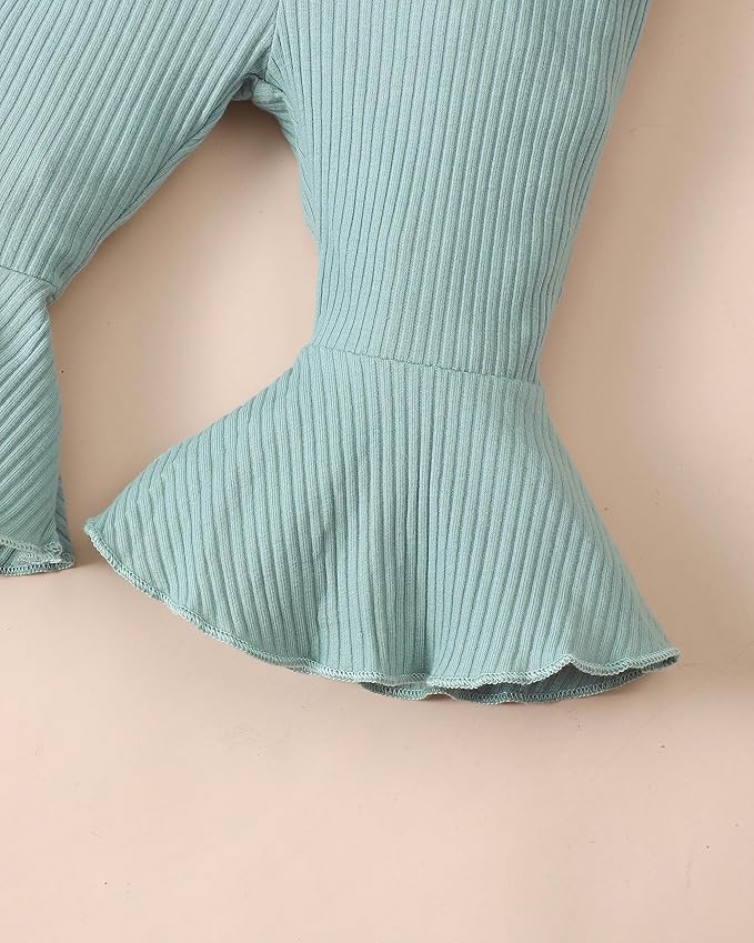 - Unique Design:Long sleeve ribbed knitted romper print with flower,The bottom of the romper has a snap-button design for easy diaper change,green bell bottom long pants with an elastic waistband.This baby girl outfit comes with a hat and headband,such a perfect 4 pieces suit gift for your little baby.
