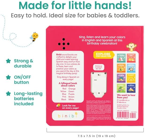 - ๐๐๐ฟ๐ฎ๐ฏ๐น๐ฒ & ๐ ๐ฎ๐ฑ๐ฒ ๐๐ผ๐ฟ ๐๐ถ๐๐๐น๐ฒ ๐๐ฎ๐ป๐ฑ๐. Binibi bilingual English-Spanish books for babies & toddlers 1-3 are durable and feature hard covers, thick pages and rounded corners - they are made for little hands and are easy to clean! All bilingual musical Spanish books feature an on/off button for extended battery life, and easily replaceable batteries. 3 AG10 batteries in every book.