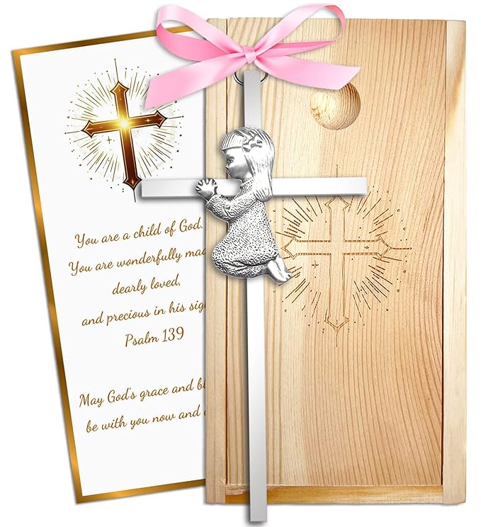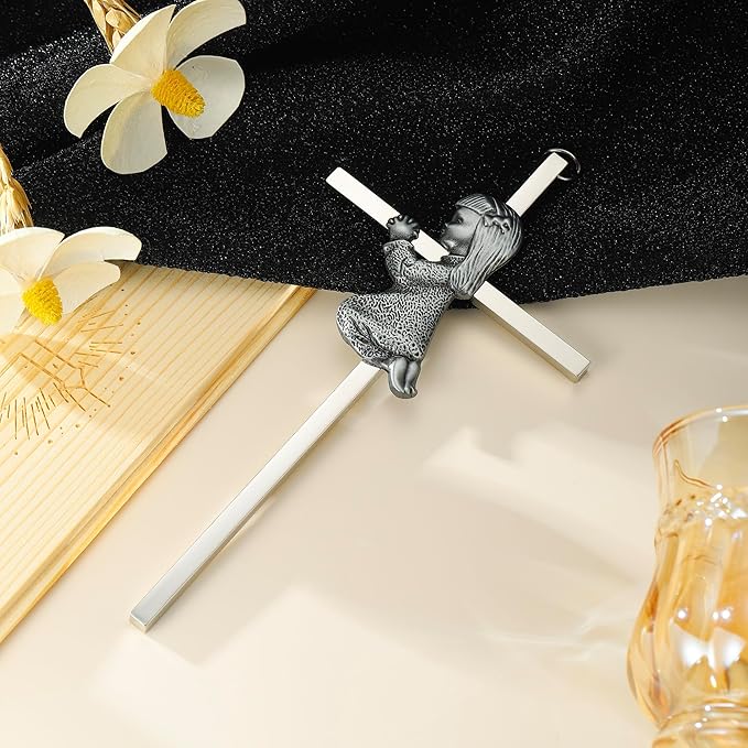 - Made with detailed workmanship, these 6-inch silver praying crosses feature a retro metallic color praying boy or a praying girl, ideal for a child’s christening ceremony.