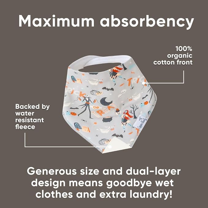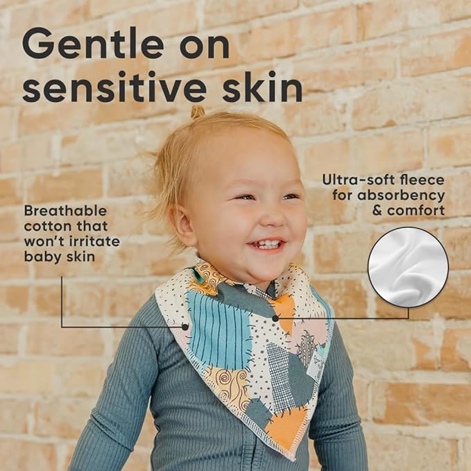 - ABSORBENT COTTON DROOL BIB; These stylish drool bibs are made of 100% absorbent cotton on the front and 100% polyester fleece on the back; The front of the baby bib is a stylish knit fabric and the back is a super soft fleece that keeps your baby completely dry even with the drooliest of babies; Great for teething babies