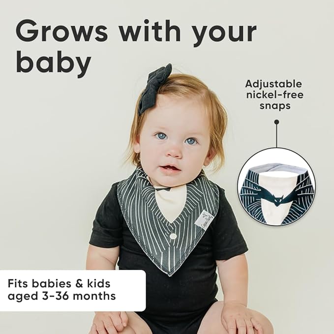 - ADJUSTABLE NICKEL FREE SNAPS; Each baby bandana bib comes with 2 nickel-free snaps that allow each bib to be adjustable in size to fit newborns and toddlers, with ages ranging from 3-24 months; The snaps are secure, making it difficult for infants and toddlers to unfasten but are easy for parents to snap on and off