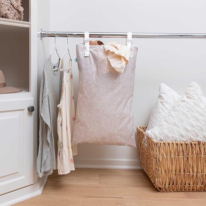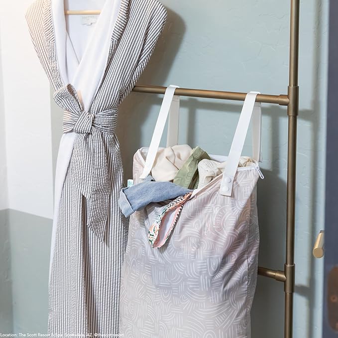 - HANGING WET BAG – Essential for travel and laundry; hang in closet, playroom, nursery or hotel closet rod; pack dirty clothes, tote wet swimsuits, diapers and more; alternative to large hampers, these totes can fold and lay flat when not in use