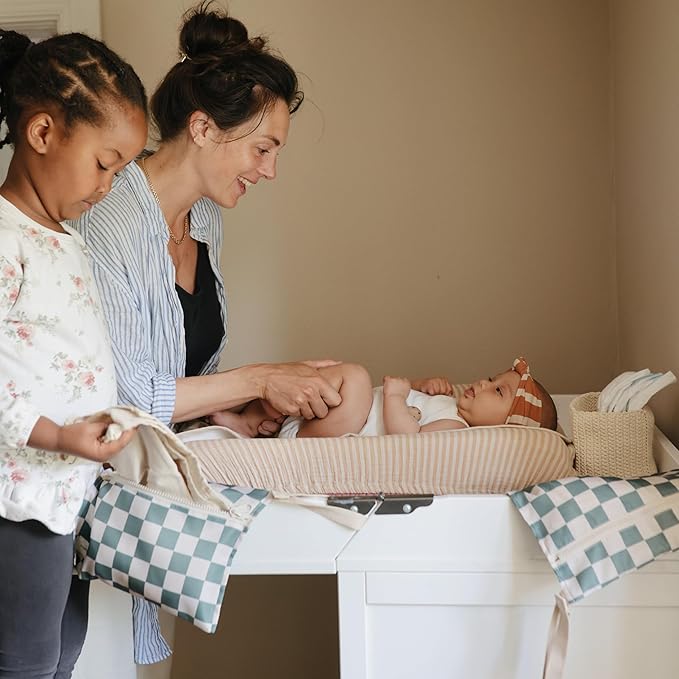 mushie Water Resistant Wet Bags | Large & Small Reusable Storage Bag for Baby Items and Travel | Zippered Pockets with Handle | Machine Washable, Set of 2 (Olive Check)