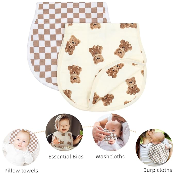 LifeTree Muslin Baby Burp Cloths - 2 Pack 70% Viscose from Bamboo and 30% Cotton Large 22'' by 10'' Absorbent Milk Spit Up Rags - Burping Cloths for Newborn, Girls Boys, Bear and Checkered