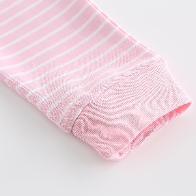 - Bodysuit and Pants Set Design 1: Bodysuit has three metal snap buttons at the bottom for easy changing. The pants have elastic and shrinkable cuffs for easy play