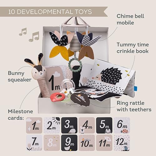 - High Contrast Design - Enhance your baby's visual development with our black and white baby toys, specially crafted to support newborn eyesight. Featuring 10 developmental toys! Enhance tummy time with the black & white crinkle book for sensory stimulation, stimulate visual & auditory senses with the chime bell mobile & promote motor skills with the ring rattle. Use the bunny squeaker for additional sensory engagement. Document precious milestones with the double-sided milestone cards.