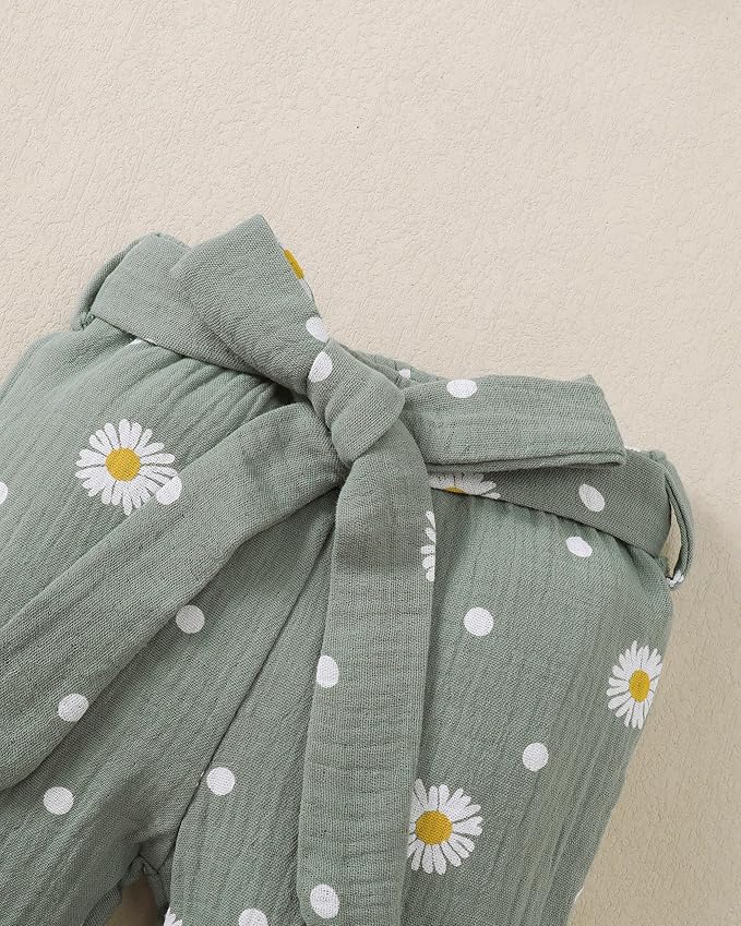 - Unique Design:A solid white color long sleeve ribbed knitted romper matching adorable ruffle fly sleeve,The bottom of the romper has a snap-button design for easy diaper change, white daisy print long pants with an elastic waistband, in front of which fixed with a big bowknot.This baby girl outfit comes with a hat and headband,such a perfect 4 pieces suit gift for your little baby.