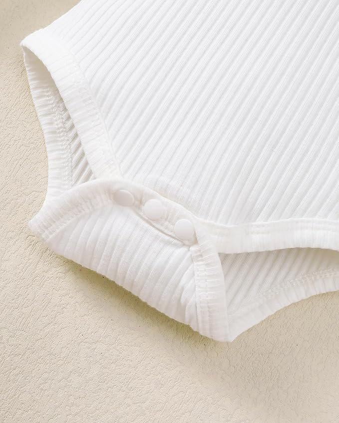 - Unique Design:A solid white color long sleeve ribbed knitted romper matching adorable ruffle fly sleeve,The bottom of the romper has a snap-button design for easy diaper change, white daisy print long pants with an elastic waistband, in front of which fixed with a big bowknot.This baby girl outfit comes with a hat and headband,such a perfect 4 pieces suit gift for your little baby.