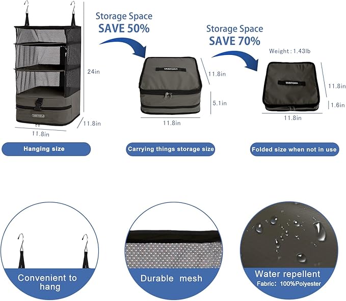 TABITORA Portable Hanging Travel Shelves Bag Packing Cube Organizer Suitcase Storage Large Capacity (Taupe L)