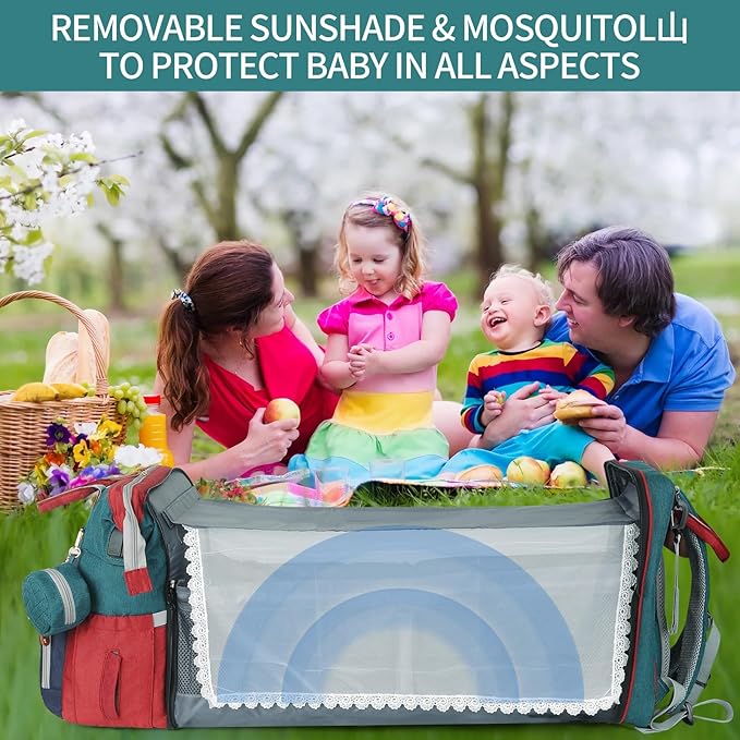 - diaper bag with changing station: The diaper bag backpack's changing station unfolds to measure: 28 x 12.5 x 8.5 inches, thick and comfortable pad; The diaper backpack' changing station includes a mesh cover and a rod for hanging toys