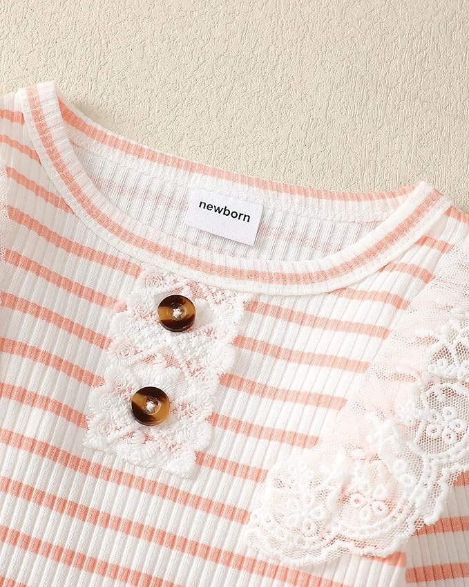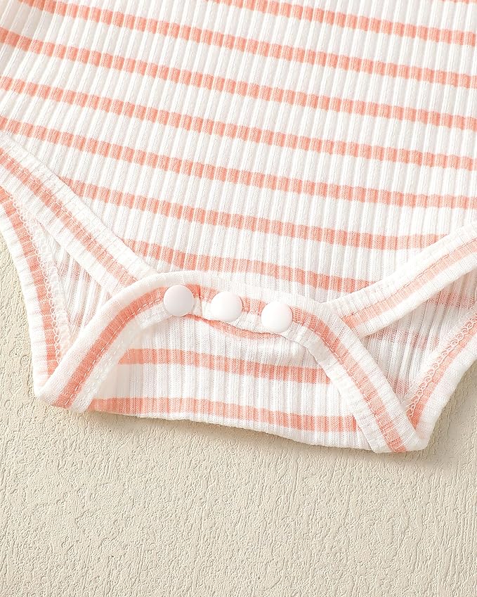 - Unique Design:A white color long sleeve ribbed knitted romper matching adorable ruffle fly sleeve,The bottom of the romper has a snap-button design for easy diaper change,pink strip long pants with an elastic waistband, in front of which fixed with a big bowknot.This baby girl outfit comes with a hat and headband,such a perfect 4 pieces suit gift for your little baby.