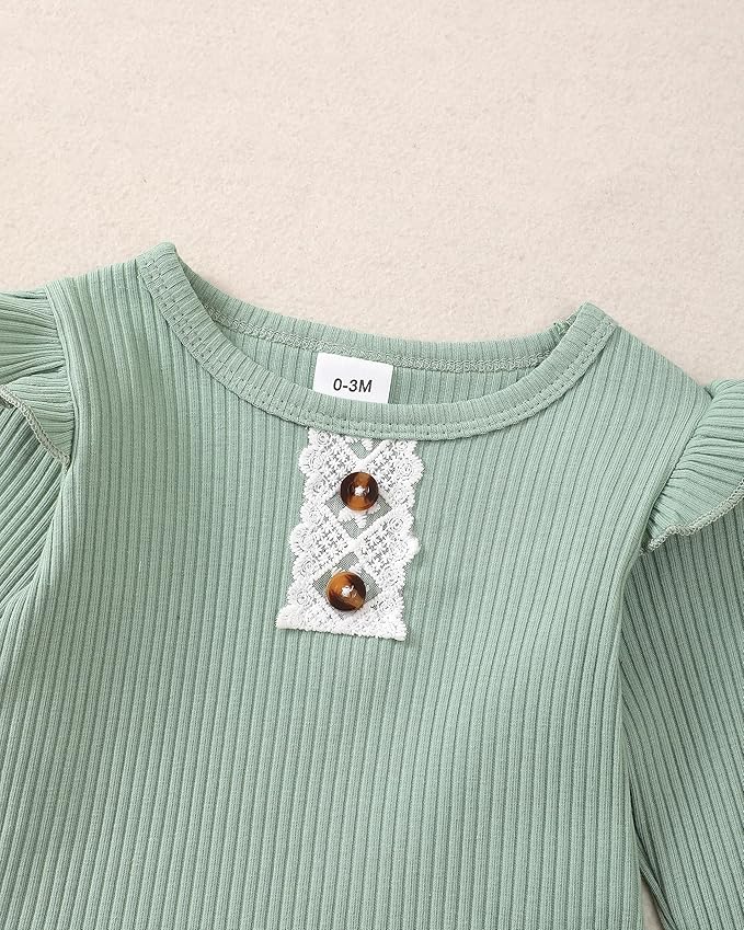 - Unique Design:Long sleeve ribbed knitted romper print with flower,The bottom of the romper has a snap-button design for easy diaper change,green bell bottom long pants with an elastic waistband.This baby girl outfit comes with a headflower and headband,such a perfect 4 pieces suit gift for your little baby.