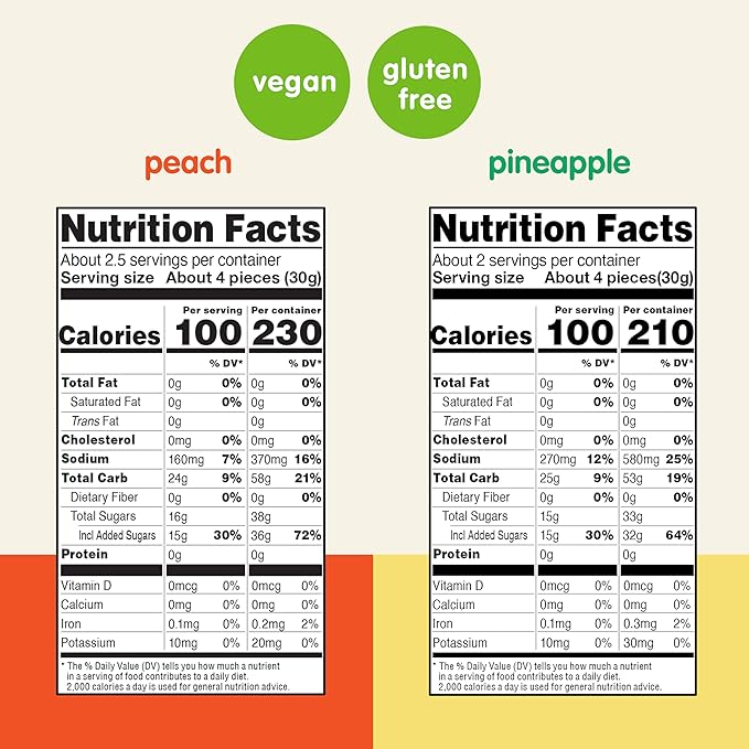- Perfect for Any Snacker: Our variety pack of fruit gummies with Tajin Clasico includes three bags of each: mango (2.25 oz), pineapple (2.25 oz), peach (2.5 oz), and watermelon (2.25 oz). They are a low-fat, vegan, and gluten-free snack.