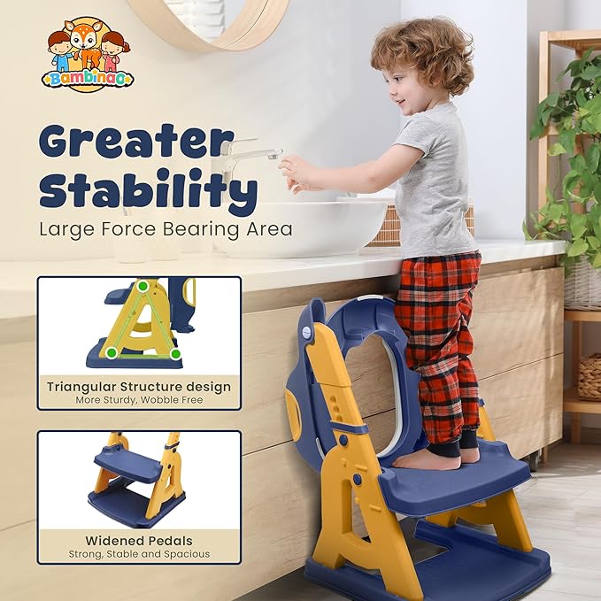 - [SAFE & STURDY TRIANGULAR STRUCTURE]: The Bambinao potty training seat is built with an upgraded triangular frame and reinforced rear crossbar, offering superior stability compared to traditional kids toilet seats. Its wide anti-slip pedal gives toddlers extra room to climb and turn safely without fear of wobbling or slipping. Combined with multiple non-slip contact points on both the base and seat, this heavy-duty structure acts like a secure toilet trainer for boys and girls, preventing tipping or shaking during use. The durable, load-bearing design supports growing children with confidence, making every potty training step safe, stable, and reassuring.