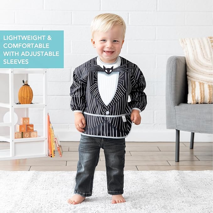 Bumkins Disney Sleeved Bib for Girl or Boy, Baby and Toddler for 6-24 Mos, Essential Must Have for Eating, Feeding, Baby Led Weaning Supplies, Long Sleeve Mess Saving Food Catcher, Jack Skellington
