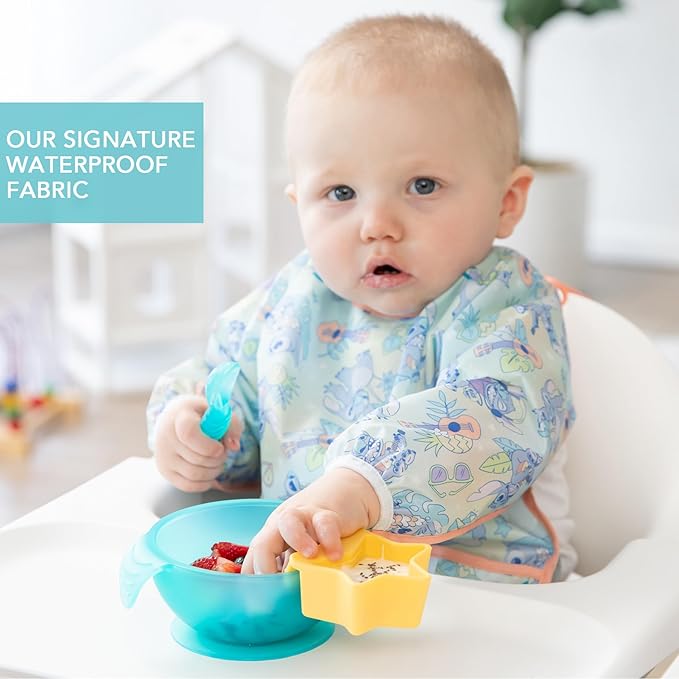 Bumkins Disney Sleeved Bib for Girl or Boy, Baby and Toddler for 6-24 Mos, Essential Must Have for Eating, Feeding, Baby Led Weaning Supplies, Long Sleeve Mess Saving Food Catcher, Aloha Stitch