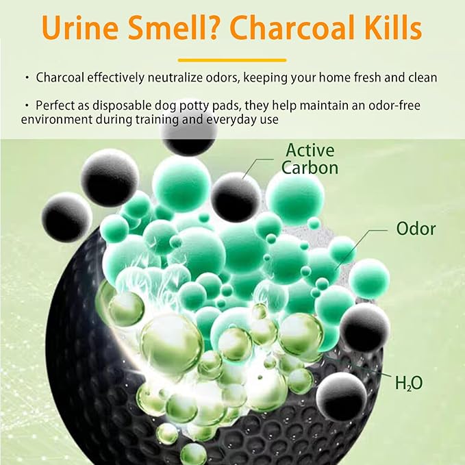 - Superior Odor Control: Our premium pee pads are designed with advanced odor-neutralizing technology, featuring activated carbon charcoal that effectively eliminates unpleasant smells. Keep your home smelling fresh and clean, no matter how many pets you have.