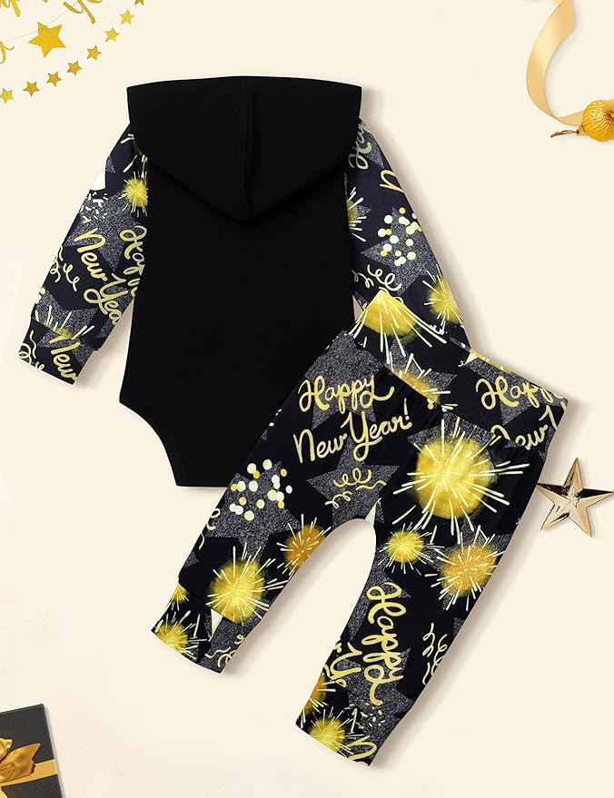 - Package Includes: 1 * Black Hoodie My First New Year Outfit + 1 * Fireworks Happy New Year Pattern Pants , as a New Year baby boy clothing gift.