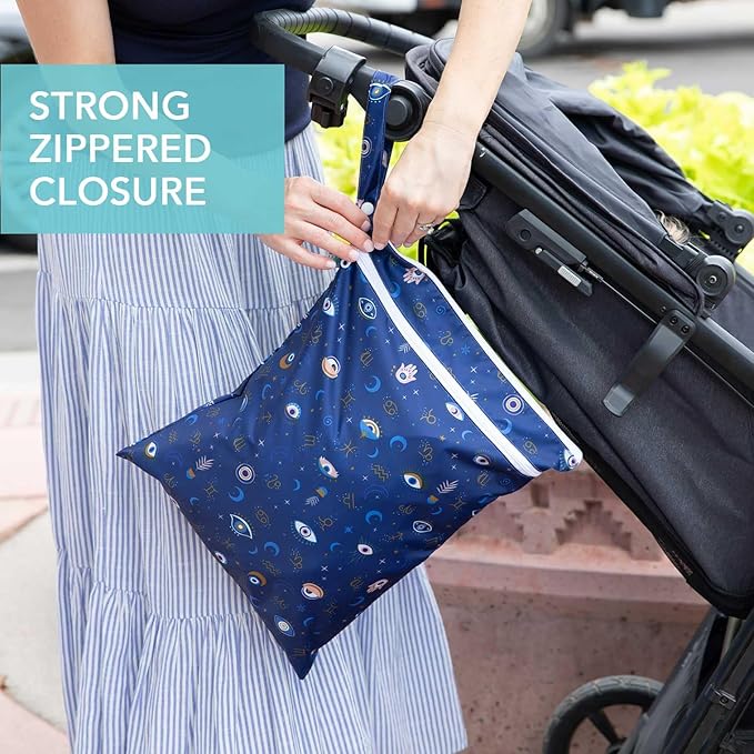 Bumkins Waterproof Wet Dry Bag for Baby, Travel, Swim Suit, Cloth Diapers, Pump Parts, Pool, Beach, Gym Clothes, Toiletry, Hook to Stroller, Daycare, Zipper Reusable Wetdry Packing Pouch, Evil Eye