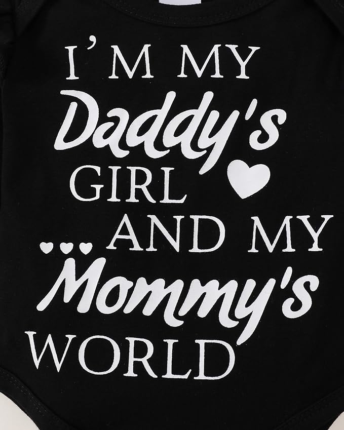 - nique Design:Long sleeve letter print “I’M MY Daddy’s GIRL AND MY Mommy’s WORLD” romper matching adorable ruffle fly sleeve,The bottom of the romper has a snap-button design for easy diaper change,gray plaid long pants with an elastic waistband.This baby girl outfit comes with a hat and headband,such a perfect 4 pieces suit gift for your little baby.