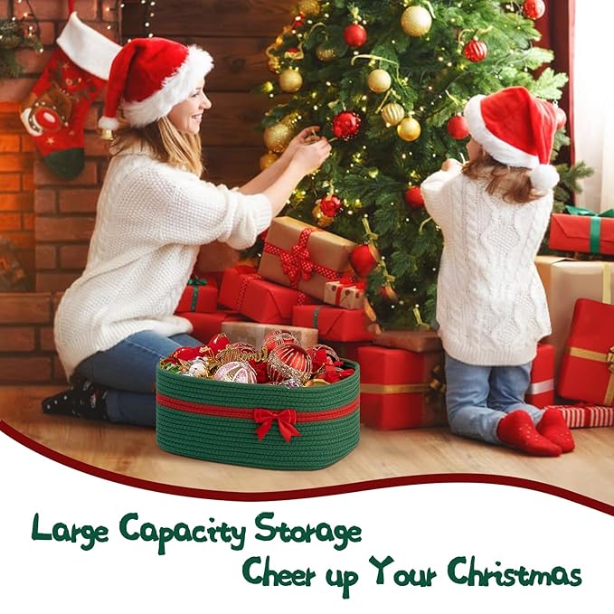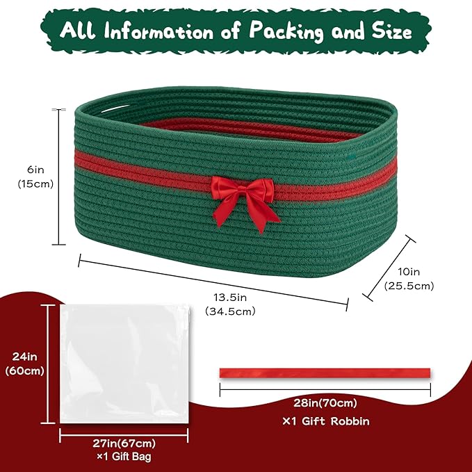 OIAHOMY Christmas Basket with Gift Bags and Ribbons, Woven Storage Basket for Decorations, Nursery, Pets - Green
