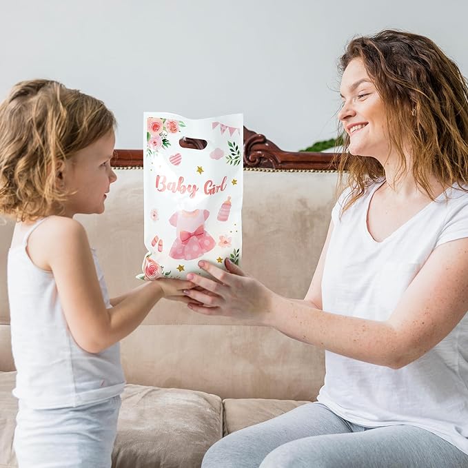 - RELIABLE PLASTIC: Our pink party favor bags are made of reliable quality PE, sturdy and reliable, reusable, smooth surface, won't cut your kids' hands. The baby shower party favor bags are also designed with hollowed out carry handles for easy carrying. In addition, you can store them folded for your next party.