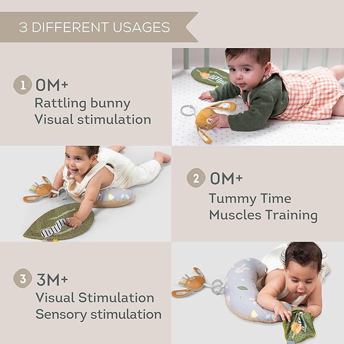 - Developmental Benefit - The Taf Toys Tummy Time Training Set is not just about comfort; it's a sensory adventure for your baby. With the Rattling Bunny Hanging Toy and Leaf Crinkle Toy, your little one will be encouraged to reach, grasp, and explore, promoting cognitive development and fine motor skills. This baby toy essentials is a must-have baby essentials for parents who want to provide their babies with a comprehensive tummy time experience.