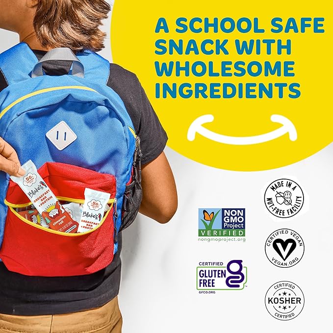 - Wholesome Fuel for Busy Days – Start the day strong with 5g of clean plant protein, hearty whole grain oats, and crave-worthy flavor. Blake's breakfast bars for kids make mornings easier (and tastier) with feel-good fuel in every bite