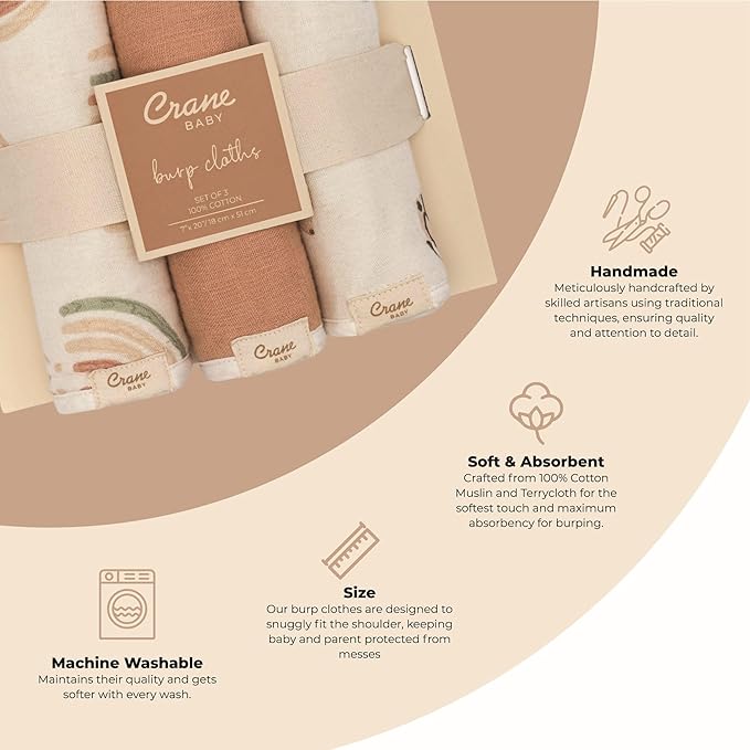 - Cotton Muslin Burp Cloths - Made from 100% Cotton, These Muslin Burp Cloths Feature a Terry Cloth Backing for Added Comfort and Absorbency, Making Crane Baby Burp Cloths a Newborn Baby Essentials Item