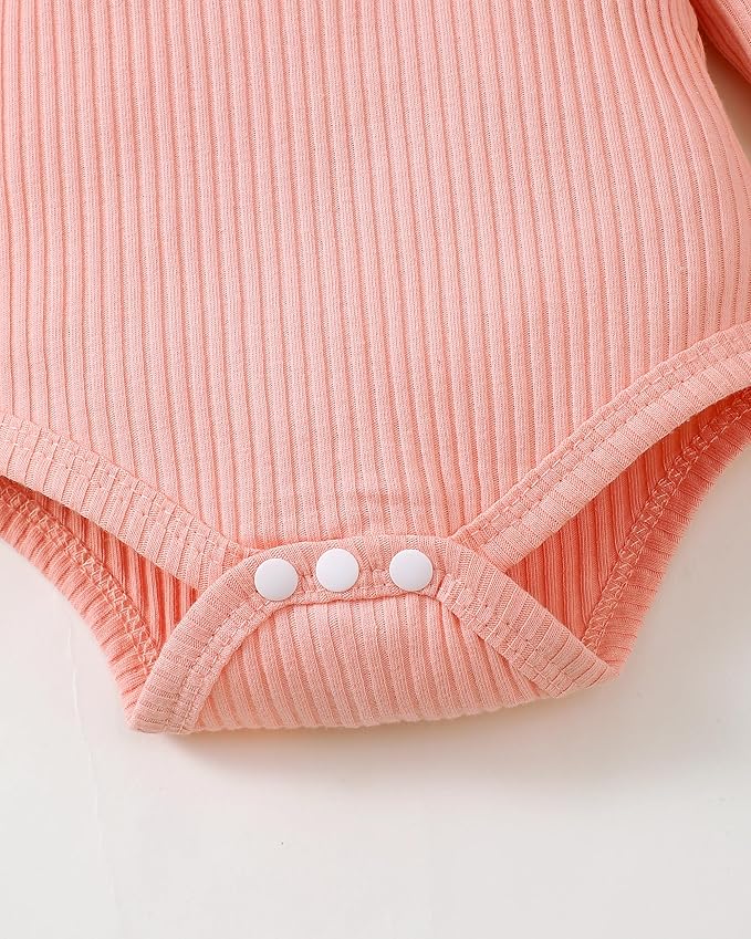 - Unique Design:A solid pink color long sleeve ribbed knitted romper matching adorable ruffle fly sleeve,The bottom of the romper has a snap-button design for easy diaper change, pink flower long pants with an elastic waistband, in front of which fixed with a big bowknot.This baby girl outfit comes with a hat and headband,such a perfect 4 pieces suit gift for your little baby.