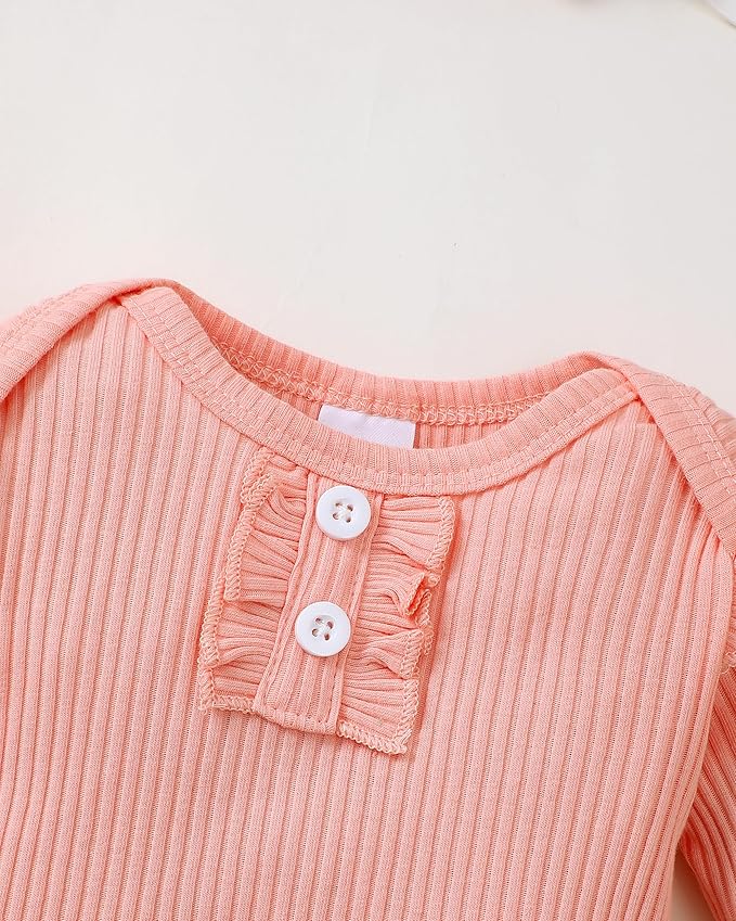- Unique Design:A solid pink color long sleeve ribbed knitted romper matching adorable ruffle fly sleeve,The bottom of the romper has a snap-button design for easy diaper change, pink flower long pants with an elastic waistband, in front of which fixed with a big bowknot.This baby girl outfit comes with a hat and headband,such a perfect 4 pieces suit gift for your little baby.