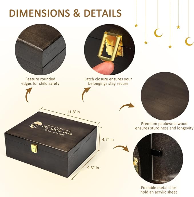 - Eternal Guardian of Precious Memories - Baby keepsake box is the ideal solution for preserving your child’s mementos, photos, and trinkets. Feature rounded edges for child safety, latch closure to keep items secure, and foldable metal clips to hold the acrylic sheet in place. Crafted from premium paulownia wood, our newborn keepsake box surpasses paper boxes, safeguards your little one's precious keepsakes forever!
