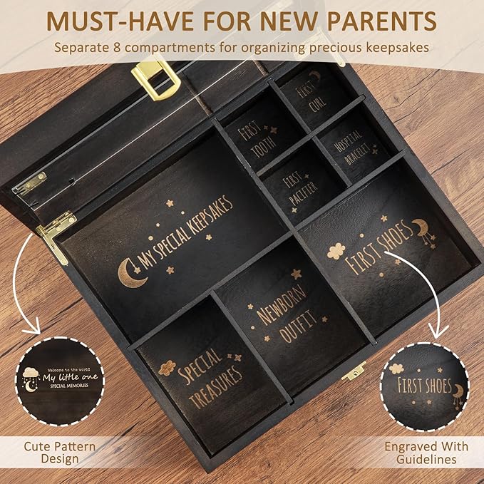 - Larger Size & Cute Design - 11.8L x 9.5W x 4.7H inches. In the eyes of parents, every child is a shining star. Our baby organizer box celebrates and records the arrival of your baby with a cute design of the moon, stars and cloud, crafted WELCOME TO THE WORLD MY LITTLE ONE, treasuring your baby's first memories. Featuring eight compartments with engraved guidelines, it offers organized storage and comes with a thoughtful checklist card for new moms to store all baby's collections in the box!