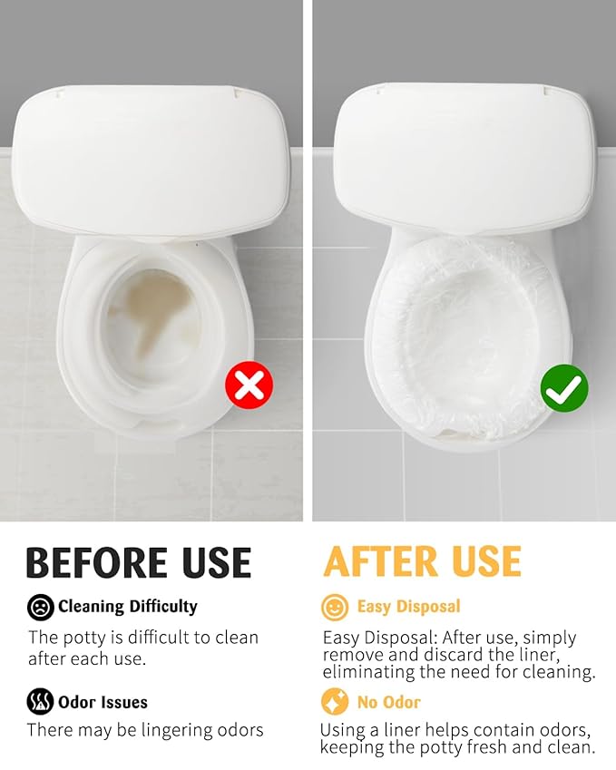 - Convenient Use and Clean:Each liner is individually micro-compressed and features a drawstring neck for secure attachment to the potty. The snug design prevents leaks, allowing for easy removal and disposal after use.