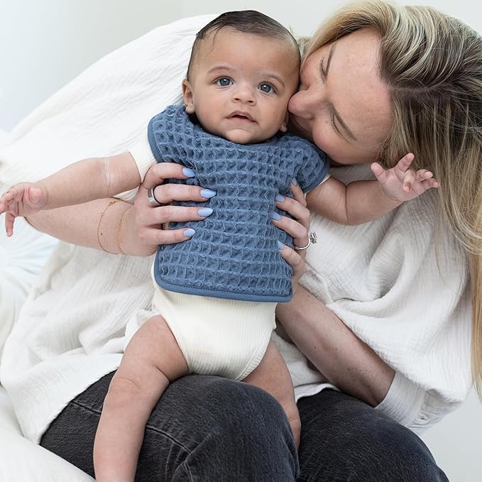 - SOFT, ABSORBENT FABRIC: Our baby boy and baby girl bibs and burp rags are made with 100% waffle cotton on one side, while the terry fabric side is made with 70% cotton and 30% recycled polyester, making them soft, absorbent, and easy-to-clean.