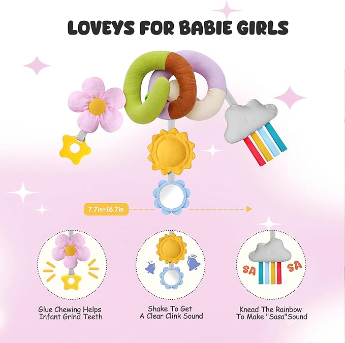 - Versatile Multi-Scene Use & Adjustable Design: This spiral toy easily attaches to car seats, strollers, cribs, play gyms, and more, making it perfect for use at home or on the go. The rope length is adjustable to fit various car seat arches or stroller handles. The four plush toys can also be disassembled for tummy time, supporting your baby’s development from 0 to 12 months old
