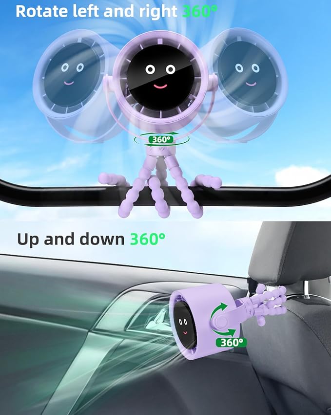 Stroller Fan Portable, Personal Fan for Travel, Air Turbo Tech & Digital display, Detachable 5 Speeds Rechargeable 360° Rotate Flexible Tripod Fan, For Home Office Stroller Camping - Purple