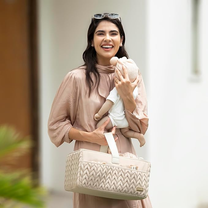 - *Elegance Meets Luxury: This portable baby diaper caddy(PATENT) is crafted using water resistant nylon along with a 3D herringbone quilting and leather handle bring a chic and modern touch. This diaper organizer caddy to make diaper changing a simple and joyful experience for both parent and baby. The black,dusty rose,ash blue, beige and mint green is available.