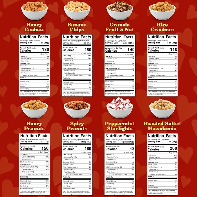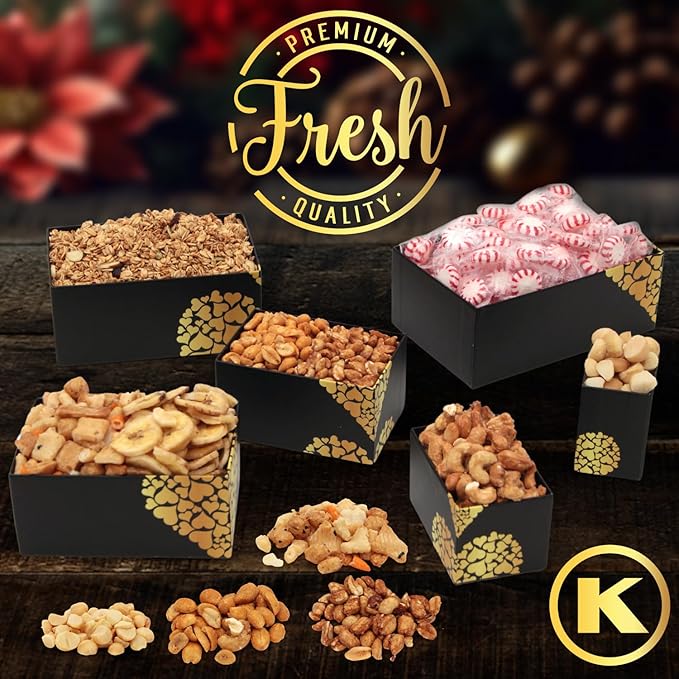 - Food Gifts: This nuts basket includes Honey Cashew, Honey Peanuts, Granola Fruit and Nut, Peppermint Starlights, Banana Chips, Spicy Peanuts, Rice Crackers, Roasted Salted Macadamia.
