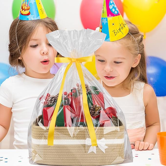 OIAHOMY Large Woven Storage Basket with Handles for Nursery Living Room Shelves, Bow Basket for Gifts Empty with Gift Bags and Ribbons for Baby Showers Pet Toy Bin - Yellow