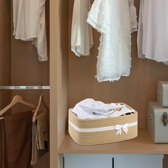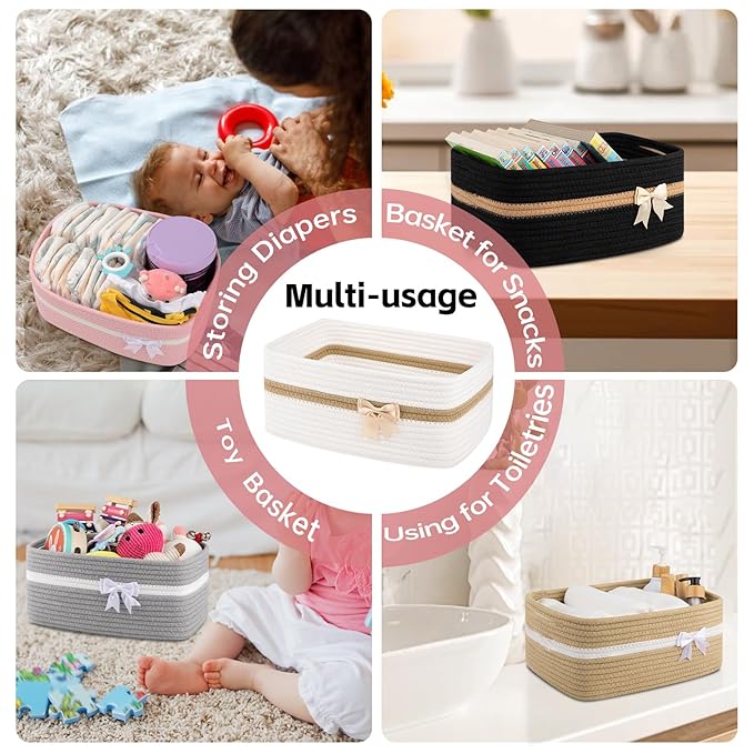- Multi functional storage: The woven baskets has multiple practical functions and can store daily small items such as books, diapers, keys, fruits, snacks, etc. It can be used as a children's toy basket, dog toy basket, toiletries basket, shelf basket, or desktop organizing basket. It has a wide range of applicability and can be easily integrated into various home spaces, such as living rooms, bedrooms, children's rooms, washbasins, etc
