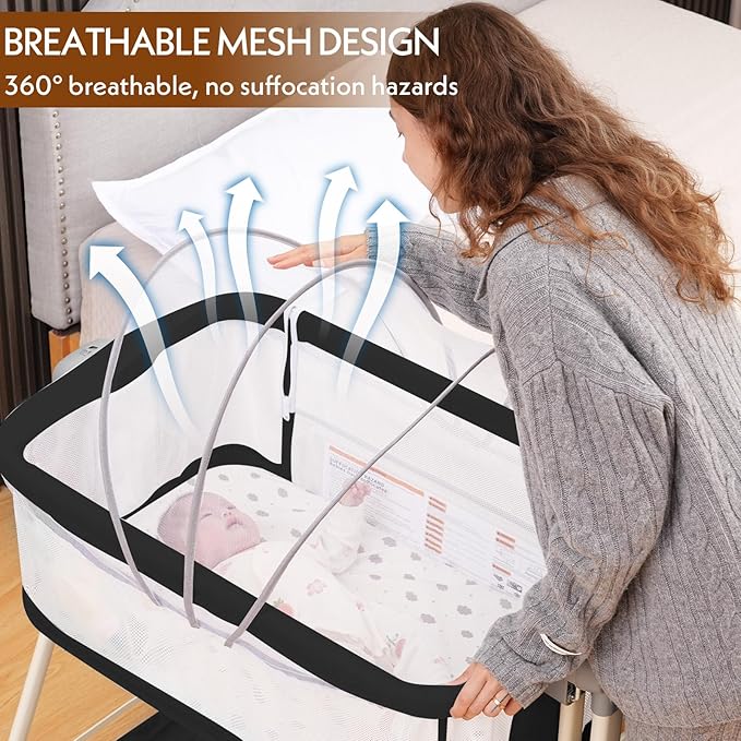 - BREATHABLE FULL MESH DESIGN: Unlike other baby bassinet, our rocking bassinet features an open 4-sided mesh design. The mesh fabric provides good breathability and visibility for the baby, allowing them to see their parents when they turn their heads, and allowing parents to see the baby when lying in bed, so they can sleep more soundly. The independent storage basket can store daily necessities and is easy to store when needed