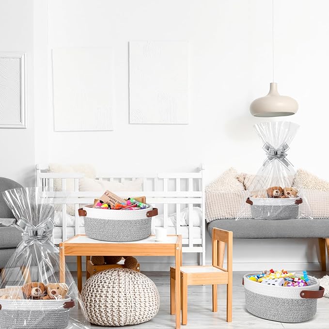 - 3 Pack Woven Basket: you will get 3 pcs 12'' x 8'' x 5'' white and grey cotton rope woven baskets, 3 pcs gift wrap bags, 3 pcs 6.3'' x 9'' large bows. Note: Due to the limitations of the shipping and packing method, the woven basket may be folded or creased upon arrival, for a better appearance of the basket, you can use a cylinder to place inside the basket to shape it, or you can use an iron to flatten it